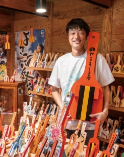 「土産物の加工や卸販売の会社として、半世紀以上前に創業したのですが、1996年に工房を立ち上げ、鳴子の製造に軸足を置くようになりました」と話すのは、やまもも工房の公文佑典(くもんゆうすけ)さん。もともと鳴子とは、両面に取り付けたバチ(木片)が本体に当たって出る音により、田畑を荒らすスズメを追い払うための農具。よさこい祭りでは、これを手に持って踊るのが慣らいとなっている。「バチを片側だけにして装飾を施したり、多様なデザインを生み出したり。鳴子にデザイン性を持たせたのは私の父のアイデア」と公文さん。今や県内外の多くの人から、オリジナルデザインの鳴子の依頼が舞い込んできている。そもそも米の二期作発祥の地である高知では、米づくりに欠かせない鳴子が身近な存在であった。鳴子を通して高知の風土を伝えたいと、工房にはギャラリーを併設し、鳴子づくり体験も受け付けている。鳴子をモチーフにしたオリジナルグッズも豊富だ。