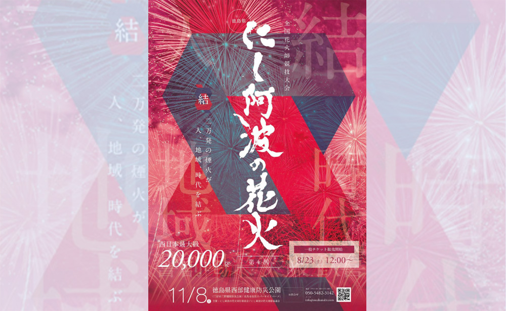 本大会は日本全国から最高峰の花火師11社が徳島に集まり、競技玉、音楽花火、メッセージ花火などの豊富なプログラムを実施する予定となっています。またとない機会ですので、是非お越しください。