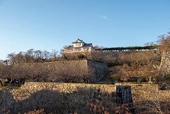10数年の歳月をかけてつくった平山城。明治の廃城令で建物は取り壊されたが、備中櫓が再現されている。地上から45m、3段に及ぶ石垣が美しく、春は桜に彩られる。