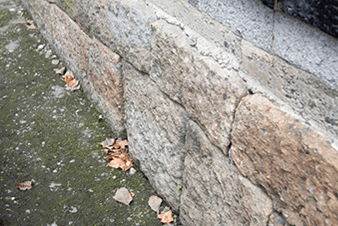 町のなにげないところに江戸時代の石組みが残っている。吉井川南の山から採石された津山石で、お城の石垣にも使用。積み方で時代がわかり、石を縦横水平に使っているものが古い。