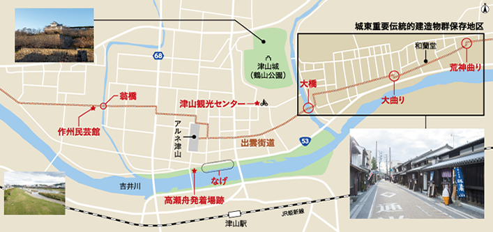 岡山県の北東部にある津山市は、城下町として発展した地。関ヶ原の戦いの後、津山に入封した森忠政によって城が築かれ、城下町がつくられました。戦災を受けていないため当時の町並みや土木資産が残り、情緒あふれるたたずまいを楽しめます。