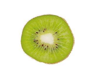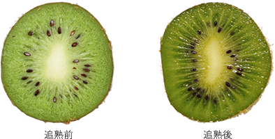キウイフルーツは収穫後に必ず追熟が必要です。追熟前の果肉は硬く白味がかり、酸味が強く、追熟すると芯まで柔らかくなり、色が濃くなって、甘く果汁があふれます。食べ頃の見分け方は、果実を縦に持ち、鼻の頭ぐらいの弾力になったら。硬い場合は冷蔵庫には入れず、常温(15~20℃の比較的暖かい部屋)で保存してください。早く食べたいときは、エチレンガスを発生させるリンゴと一緒にポリ袋に入れておくと追熟がより進みます。