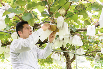 生産者のひとつ野上農園を訪ねました。日当たりのいい斜面にたわわに実ったキウイフルーツは、傷がつかないようにひとつひとつ丁寧に袋がけされています。「キウイフルーツの根はストレスに弱く、乾燥すると葉が弱るため、水はけが良く、水もちのよい深い土壌が適しているんです。当園ではオリジナルの肥料を使用し、糖度を上げるため、枝の剪定や摘果など手間暇かけて育てています」。