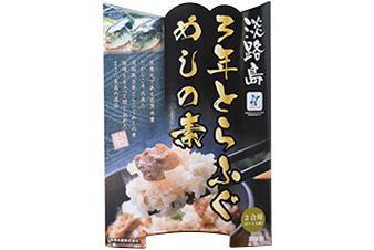 「淡路島3年とらふぐ炊き込みめしの素」(1,080円)をはじめ、カレー、煮こごりなど若男水産オリジナルの加工品も人気。