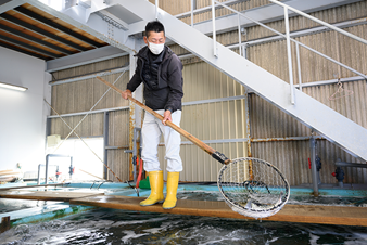 現在、5業者が養殖を手がけ、唯一生産から加工販売まで一貫して行っている若男水産を訪れると、その大きさにびっくり。2年物は800g ~1㎏で出荷されるのに対し、「淡路島3年とらふぐ」は約1.5㎏にもなります。大きいと大味になりそうですが、「一気に大きくするのではなく、健康に気づかい、エサを腹八分目に与えるなどじっくり成長させるので、天然物に引けを取らないおいしさです」ととらふぐ師の店主・前田若男さん。養殖期間を伸ばすことはリスクが大きく、稚魚から育てて3年後まで成長できるのは約半分だそう。それでも「おいしいものを食べてほしい」と丹精込めて育てています。