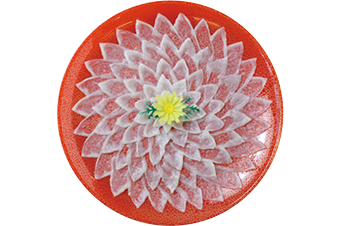 写真は、ふぐ刺し5~6人前(35cm皿)10,800円。最新の技術を利用した冷凍品もある。