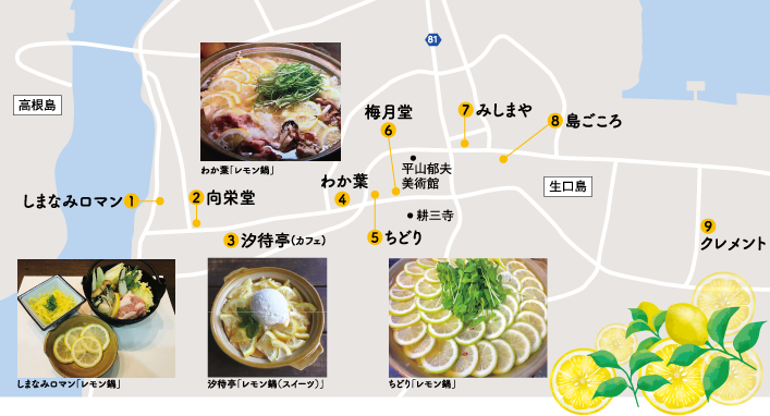 瀬戸田には産地ならではのこだわりのレモン鍋やスイーツを楽しめる店がたくさんあります。