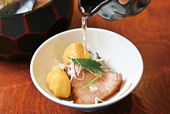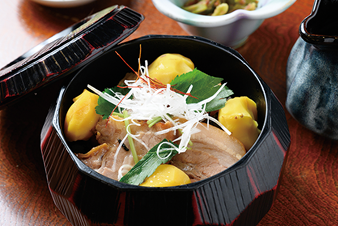 素材の持ち味を生かした鹿野川荘の「とんくりまぶし」1,200円(秋~冬限定メニュー)コンブとカツオのダシがふくよかな風味を加える。
