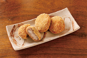 伝統料理「いもたき」がコロッケに変身。肱川の豊富な水と肥えた土で育った里芋を油揚げや鶏肉などと甘めに煮込んだ伝統の味が凝縮。