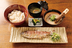 清流で育ったアマゴは臭みがなく美味。香ばしく焼き上げ、大洲特産の麦味噌のさつま汁と一緒に温かい白ご飯にかけて味わいます。