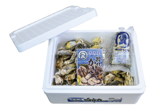 牡蠣は大きさを選んでキロ売り。殻付き大5kg 4,500円、殻付き小5kg 3,000円など。