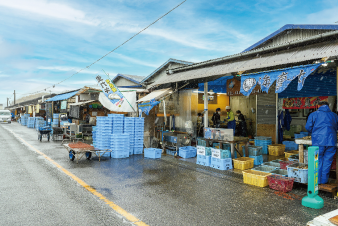 海沿いに牡蠣工場が並ぶ。土日は行列ができることも。