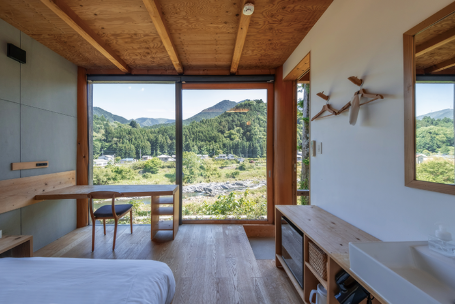 築70年の古民家をリノベーションした母屋(フロント兼食堂)と、町産のヒノキやスギを使った全室リバービューの宿泊棟で構成。地元の農家さんから持ち込まれた、旬のオーガニック野菜が主役の食事メニューも好評(夕食は3日前までの事前予約制)。宿名「WEEK」には、ゆっくりと過ごしてほしいとの想いが込められている。