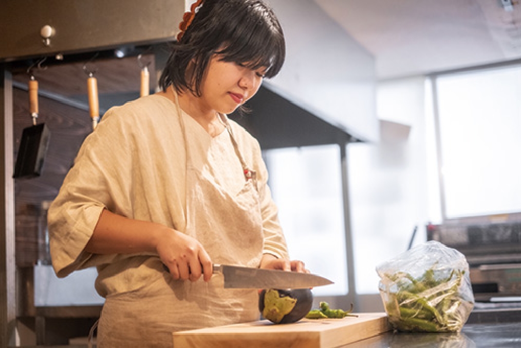 北海道出身。六本木のフレンチレストランで料理修業した後、北海道でカフェの立ち上げを行う。2023年10月に大夢さんと結婚。「弥栄」の料理長として腕をふるう日々。