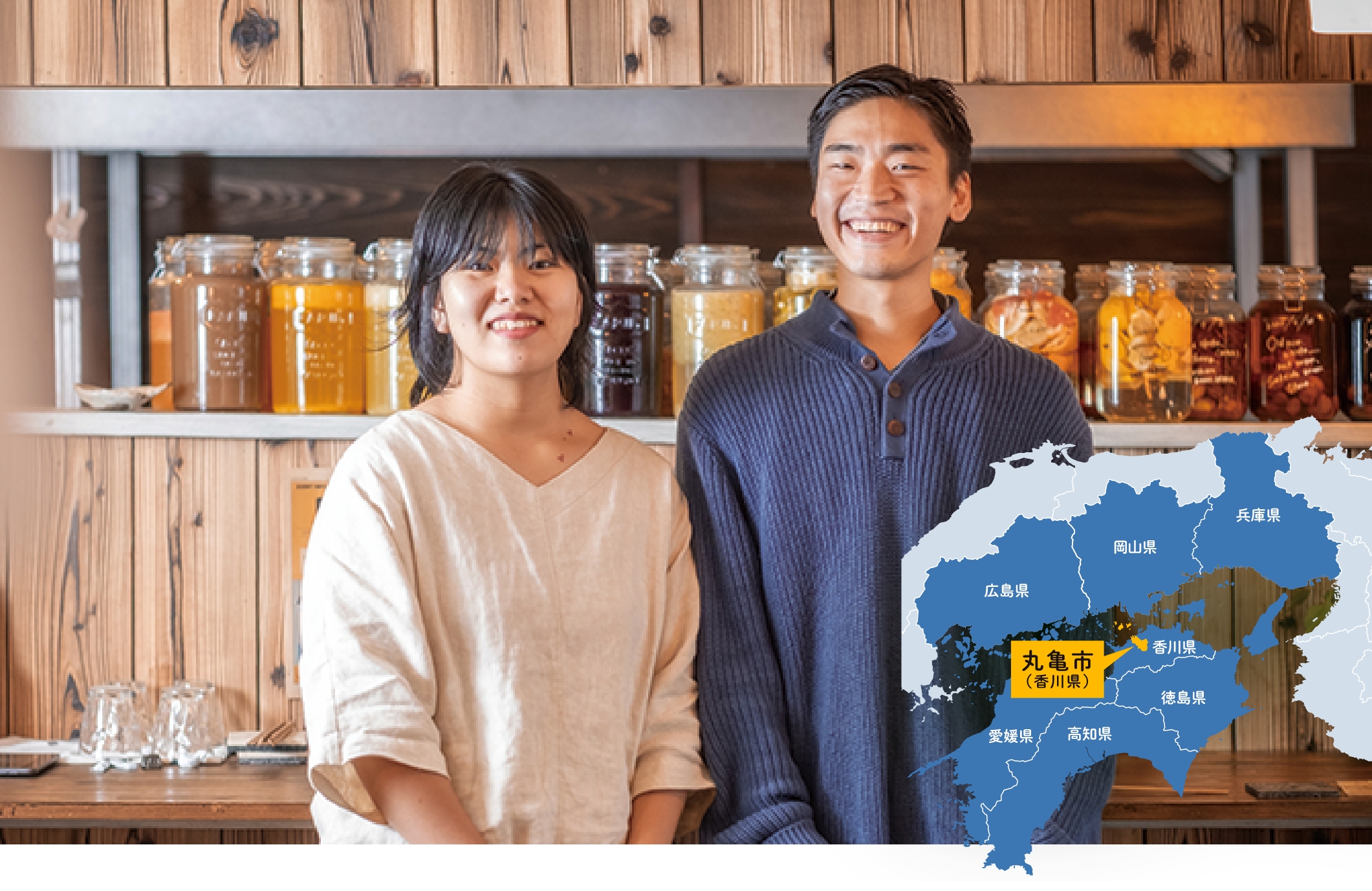 吉田大夢(ひろむ)さん、麗愛(れな)さん夫妻が営む「弥栄」は、丸亀市役所の目の前にある。千葉県出身の大夢さんと、北海道出身の麗愛さんが知り合ったのは、大夢さんが仲間と共に起業した東京のアパレル会社。やがてふたりは交際を始めるが、忙しさのあまり体調を崩した大夢さんは大きな決断をする。同郷の友人と丸亀市出身の友人と共に、香川県で農業を営むことにしたのだ。「友人の親戚が観音寺市で農業をしており、後継者がいないことから3人で引き継ごうという話になったんです」。